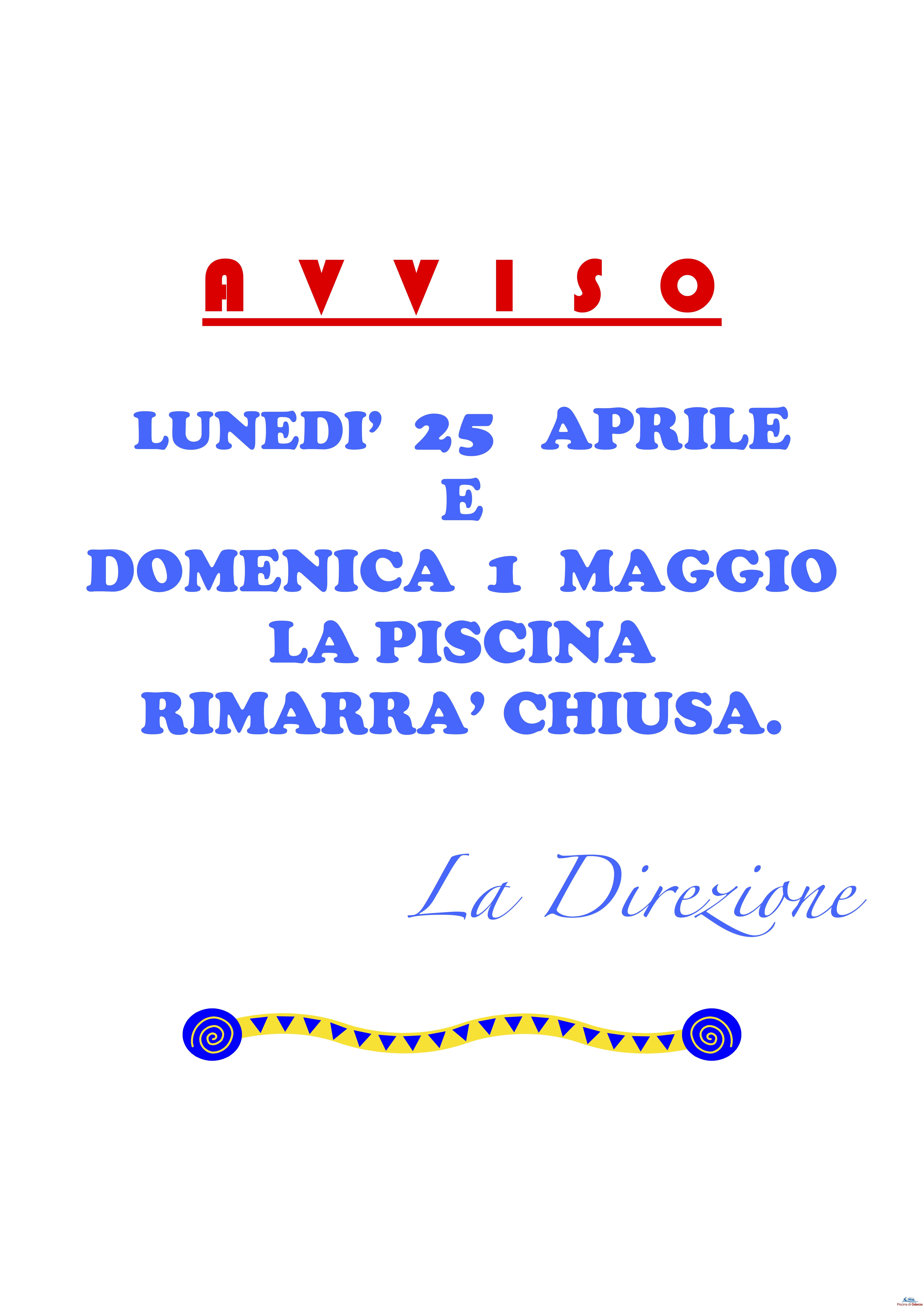 Chiusura 25 aprile e 1 maggio. Articolo del 14/04/2016 ‹ › × × Chiusura 25 aprile e 1 maggio. Lunedì 25 aprile e domenica 1 maggio la piscina rimarrà chiusa. Commenti Abilita JavaScript per visualizzare i commenti tramite Disqus.